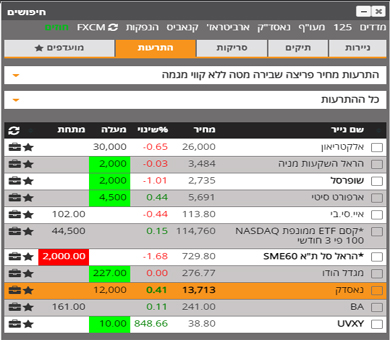 התראות מחיר, התראות מבוססים כלים טכניים והתראות מבוססות קווי מגמה. במהלך היום או בסוף היום, לטלפון או למייל או בהודעה בתוך המערכת.