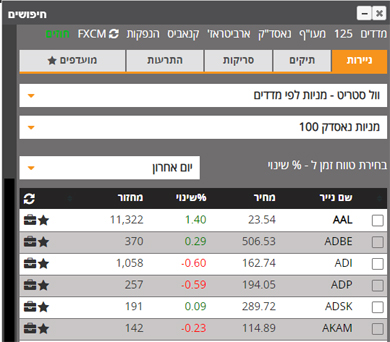 יותר מ-15 אלף מניות, מדדים, מטבעות, קריפטו, אג"ח ואופציות מסודרים באופן מופתי במסכים פשוטים, גישה מהירה ונוחה ועשרות אופציות לצפייה, איתור ושמירה.